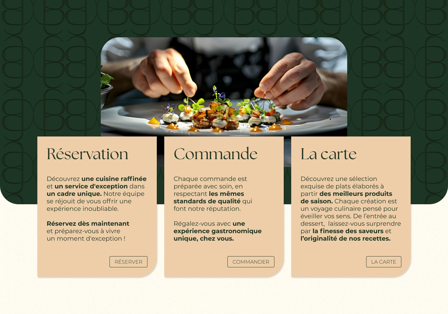 Des détails soignés, une typographie raffinée et des dorures viennent sublimer la charte graphique, tout en faisant écho à la qualité des plats servis dans l'établissement.